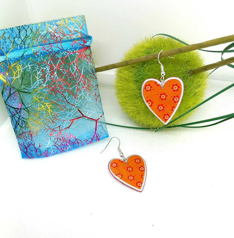 Boucles d'oreilles coeur orange/rouge à fleurs - Boucles d'oreilles fait main orange/rouge en coeur